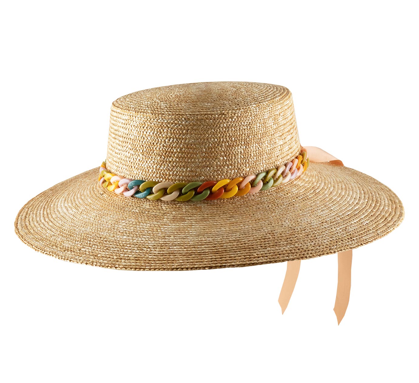 Tissé dans le respect des traditions et sublimé par une chaîne d'anneaux de résine avec une palette de couleurs pastel vibrantes, ce chapeau est l'incarnation même d'un savoir-faire raffiné et maîtrisé. La bande de garniture est complétée par un ruban satiné rose poudré échangeable, pouvant s'assortir avec une multitude de tenue.