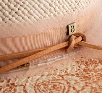 Le bord se pare d’une impression florale cuivrée, tandis qu’une plume rose poudré apporte une note de légèreté aérienne. Chaque détail évoque une élégance poétique, faisant de ce couvre-chef un véritable bijou de douceur et de sophistication.