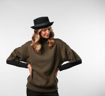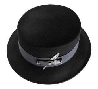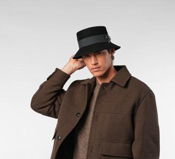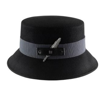 Audacieux et structuré, ce bob en feutre de laine séduit par son allure contemporaine. Il est habillé d’un large galon en gros-grain orné d'une garniture métallique en forme de plume, fixée sur une patte en cuir surpiqué.