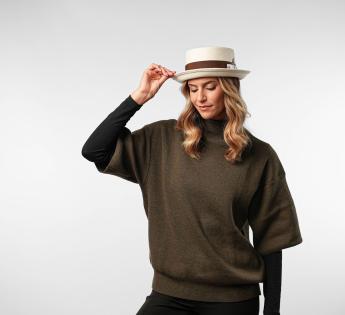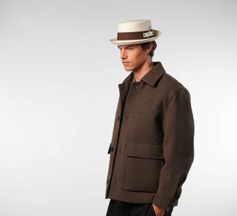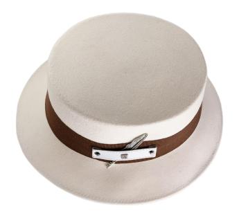 Audacieux et structuré, ce bob en feutre de laine séduit par son allure contemporaine. Il est habillé d’un large galon en gros-grain orné d'une garniture métallique en forme de plume, fixée sur une patte en cuir surpiqué.