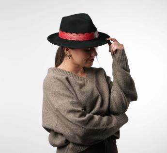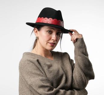 Le galon en simili cuir, travaillé comme une dentelle ajourée, apporte une touche de féminité assumée. Son contraste intense insuffle une énergie bohème et rock chic. La griffe discrète signe notre création artisanale. Ce chapeau incarne l’équilibre parfait entre sophistication, originalité et liberté de style.