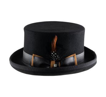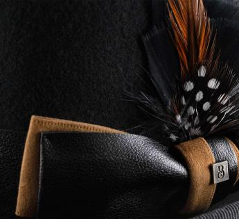Haut-de-forme bas au style affirmé, ce modèle casse les codes avec une élégance audacieuse. Confectionné dans notre atelier à Lyon, il associe un feutre de laine italien de qualité à des finitions pleines de caractère : galon en simili cuir noir, double nœud effet daim, griffe métallique et plume amovible pour une note de fantaisie maîtrisée.