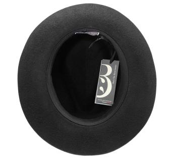 Fedora à la calotte légèrement basse. Son feutre est fendu pour créer la bague du nœud. La garniture passe ainsi délicatement dans le feutre pour un effet original. De plus, elle agit en contraste sur ce dernier grâce à la brillance du satin. Le détail en plus est ce fil argenté qui maintient le nœud.