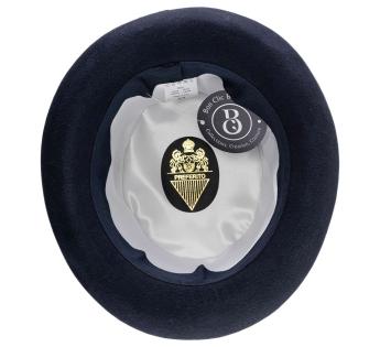 Ce haut-de-forme en feutre de laine durci incarne l’élégance dans sa forme la plus pure. Sa calotte haute, volontairement accentuée, crée une ligne verticale majestueuse, signature des grandes silhouettes d’apparat. Le feutre rigide, travaillé avec précision, assure un maintien irréprochable et une finition soignée.