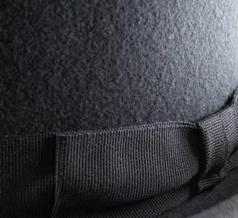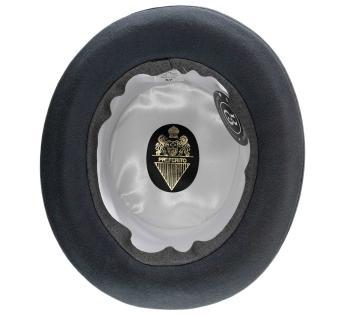 Ce haut-de-forme en feutre de laine durci incarne l’élégance dans sa forme la plus pure. Sa calotte haute, volontairement accentuée, crée une ligne verticale majestueuse, signature des grandes silhouettes d’apparat. Le feutre rigide, travaillé avec précision, assure un maintien irréprochable et une finition soignée.