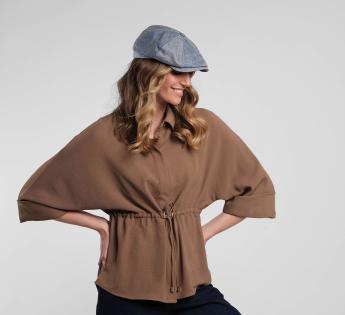 Casquette plate au style patchwork, idéale pour l’été. Sa matière respirante et sa protection anti-UV (UPF 50+) en font un allié de choix face au soleil. Chaque pan présente une texture subtilement différente, avec des chevrons et tissages variés.