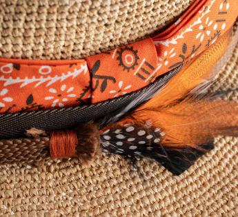 Sublimez votre style avec ce chapeau en raphia, façonné dans notre atelier lyonnais. Son tressage artisanal est rehaussé par une broderie discrète, tandis que la superposition de matières crée un jeu de textures raffiné. Galon, tresse et large nœud bandana s’harmonisent parfaitement, agrémentés de plumes pour une touche bohème.