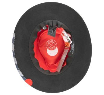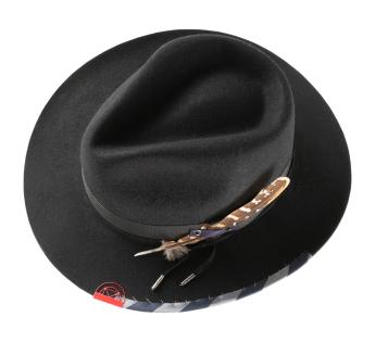 Chapeau traveller dont l'ensemble met en scène un mélange de matières avec du feutre, du métal, du satin gros grain qu'agrémente une plume. Sa calotte de hauteur standard s'unit à son bord plutôt large pour bien protéger du froid et faire de l'ombre aux yeux. Il nous offrira chaleur et confort grâce à sa matière dense.