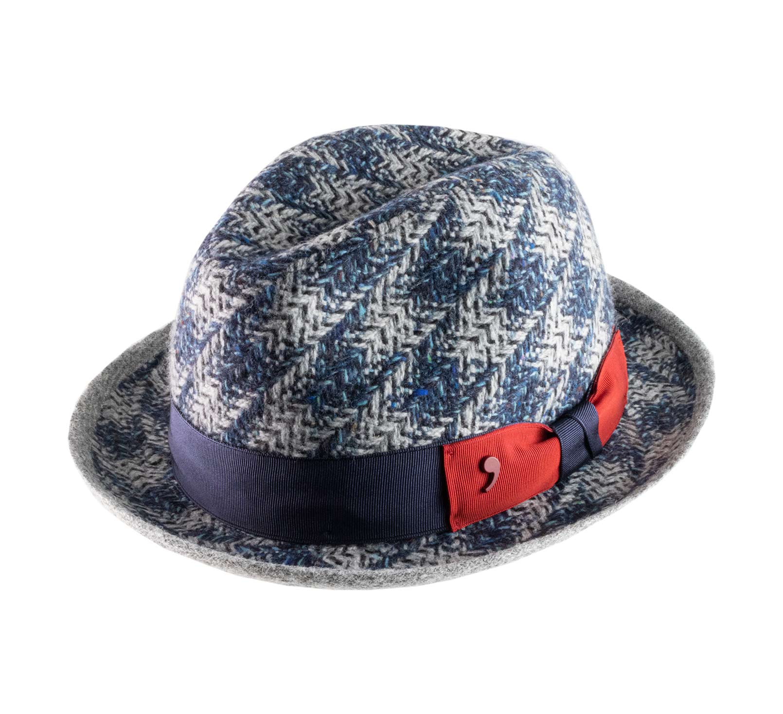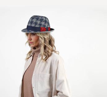 Chapeau type player en tweed pour rester au chaud sous sa calotte. Sa robe est personnalisée par des motifs géométriques gris et bleus contrastant joliment avec le nœud rouge de son galon. Un mélange donc vivant et rassurant pour établir un style incomparable et facile à combiner avec notre garde-robe.