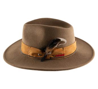 L'association de différentes matières et textures est l'une des pratiques à la mode cette saison. Voyez par vous-même avec cette combinaison feutre-daim bien pensée. Le résultat est un chapeau classique relevé d'un galon à la couleur gaie naturelle et affichant de façon réussie des surpiqûres, fantaisies et une plume. Nous profitons ainsi d'une création à laquelle il a été ajouté une belle touche de brillance.