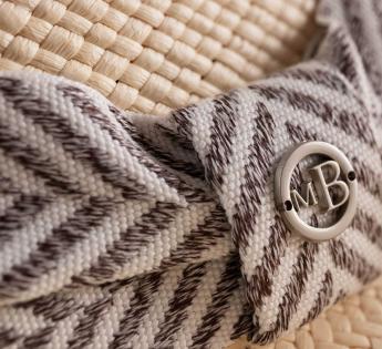 Son ruban gros grain large à chevron, orné d'un motif graphique en camaïeu, se distingue par un demi-nœud à l'arrière, légèrement relevé, ajoutant une note de sophistication discrète.