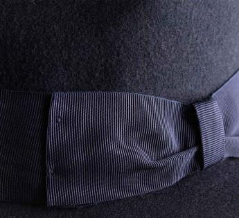 Avec son bord court et une calotte légèrement réhaussé, ce chapeau trilby se plait à être porté penché de coté ou incliné sur l'arrière, pour casser la ligne. Le galon en gros grain, terminé par un nœud plat, vient souligner l’esprit habillé du modèle.