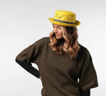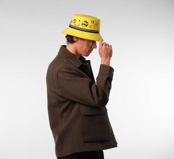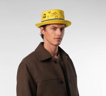 Coloré, audacieux et ultra-créatif, ce bob en feutre de laine réinvente les codes du couvre-chef. Sa calotte plate est entièrement brodée de motifs graphiques façon tatouage, pour une touche street et décalée. Le galon rayé vient structurer l’ensemble, rehaussé d'une griffe métallique au centre. Ce modèle attire tous les regards, tout en affirmant une vraie liberté de style.