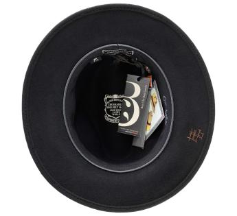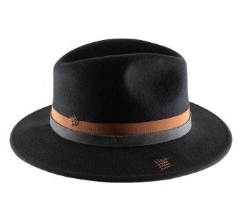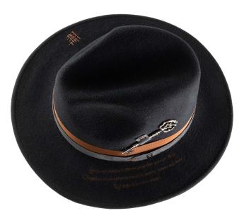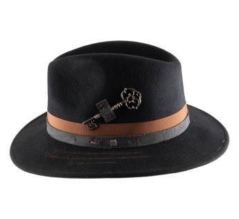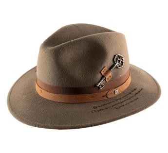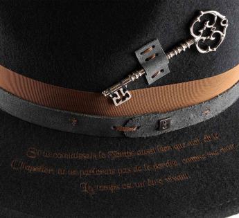 Entièrement façonné dans un feutre de laine dense et structuré, ce modèle revisite la forme classique du traveller à travers une esthétique symbolique inspirée de l’univers poétique de Lewis Carroll. Une clé ancienne, fixée en lieu et place de la plume traditionnelle, devient l’emblème du mystère du temps, un clin d’œil direct au Chapelier fou d’Alice.