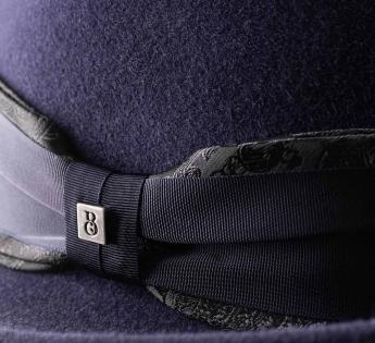 Sa garniture en satin, parfaitement assortie au feutre, est rehaussée d’un nœud au motif cachemire légèrement brillant, créant un subtil jeu de matières entre caché et dévoilé. La griffe métallique discrète souligne l’exclusivité de ce chapeau, tandis que sa doublure satinée apporte un confort incomparable. Ce trilby est un véritable bijou d’artisanat, mariant tradition et modernité avec une touche audacieuse.