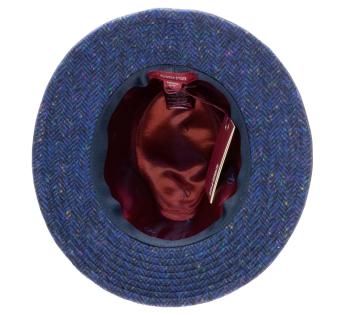 Chapeau traveller avec une conception bimatière et bicolore. Sa calotte est ainsi faite de laine tandis que son bord est découpé dans du cuir. Le dessous de ce dernier est assorti à la calotte avec une laine douce et soyeuse. Le tissu est personnalisé par des chevrons sur un effet bigarré à associer sans modération aux différentes tenues de notre garde-robe.