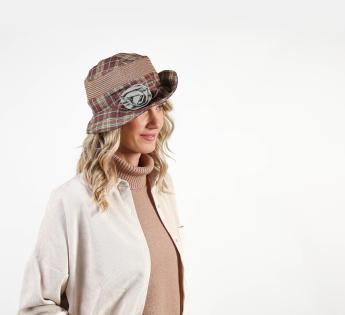 Chapeau d'été au féminin garni d'une broche amovible avec une fleur en tissu. Il est un mélange de paille cousue et de tissu au motif à carreaux bronze. Sa calotte est entourée d'un bord à moduler selon nos envies. Le design permet ainsi plusieurs styles pour à chaque fois ajouter une belle touche décontractée à notre allure.