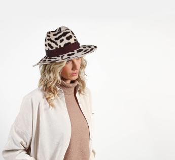 Traveller au feutre flamand obtenu à partir d'un feutre de poils de lapin sur lequel les poils ont été tirés à l'aide d'une brosse métallique, afin d'imiter la fourrure. Un visuel qui accrochera par son côté unique évocateur d'un hiver cosy. Le chapeau est personnalisé ensuite par un nœud simple avec un ajout doré. Le tout à travers un look imitation zèbre particulièrement tendance.