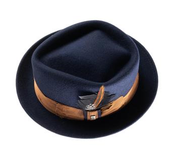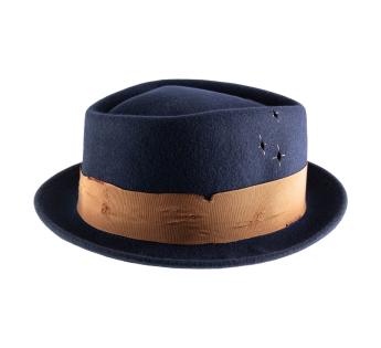 Ce porkpie revisite les codes du classique avec une touche d’audace assumée. Confectionné dans un feutre de laine à la belle densité, il dévoile une allure volontairement patinée, presque cinématographique.