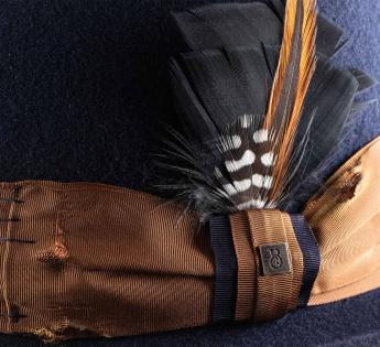 Son galon en satin a été soigneusement brûlé, effiloché et gratté pour créer un effet vieilli unique, renforcé par des broderies pour maintenir le nœud. Une plume naturelle vient souligner ce contraste entre élégance et désinvolture. Sur la calotte, des découpes ajourées brodées ajoutent relief et originalité à l’ensemble.