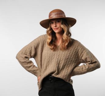 Fabriquée dans notre atelier lyonnais, cette capeline incarne un style bohème chic aux finitions raffinées. La calotte est sublimée par une dentelle cuivrée lumineuse, aux reflets métallisés, soigneusement posée à la main. Une garniture précieuse, mise en valeur par notre griffe discrète, pour un résultat à la fois élégant et audacieux.